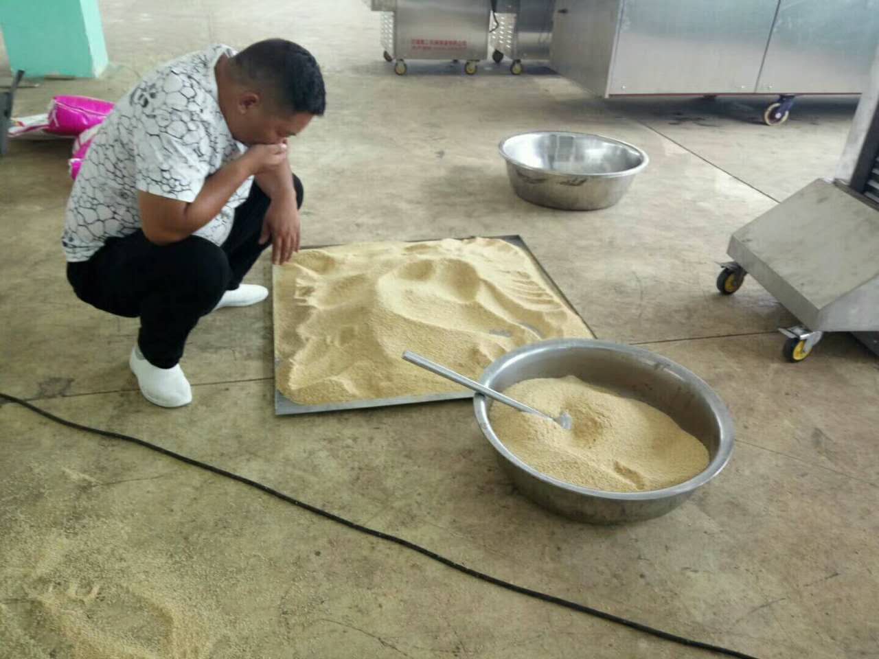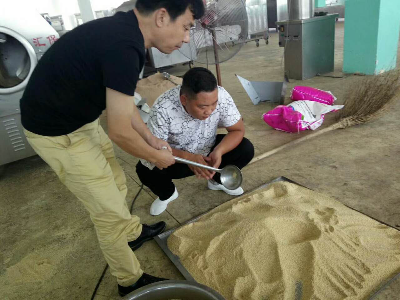 湖北做芝麻糖老板來廠考察電磁炒貨機,炒脫皮芝麻試機中
