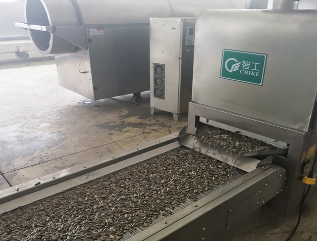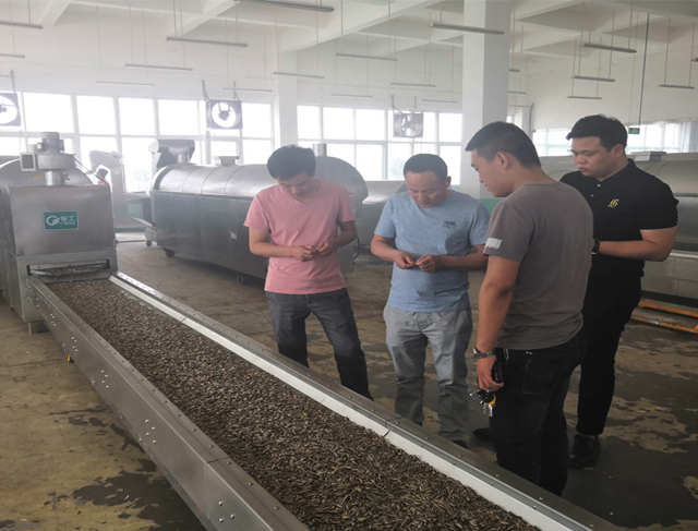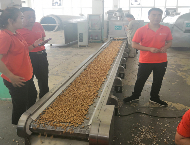 湖南、安徽兩地客戶來(lái)許昌智工現(xiàn)場(chǎng)考察電磁炒貨生產(chǎn)線設(shè)備炒制花生果、葵花籽!