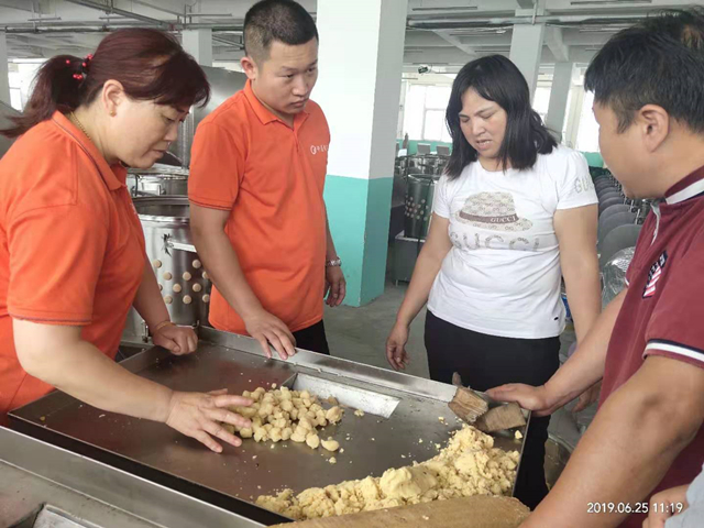 6月25日,河南周口客戶(hù)自帶原料到許昌智工考察、試機(jī)制餡機(jī)!(做糕點(diǎn))。制餡效果客戶(hù)贊不絕口!