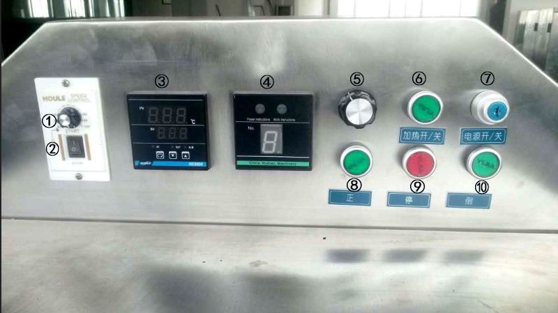 ⑥、“加熱開/關(guān)”(正面綠色):炒貨機(jī)加熱開關(guān)按鈕,按一下燈亮?xí)r開始加熱,再按一下燈滅時停止加熱。炒貨前一般需要先預(yù)加熱。