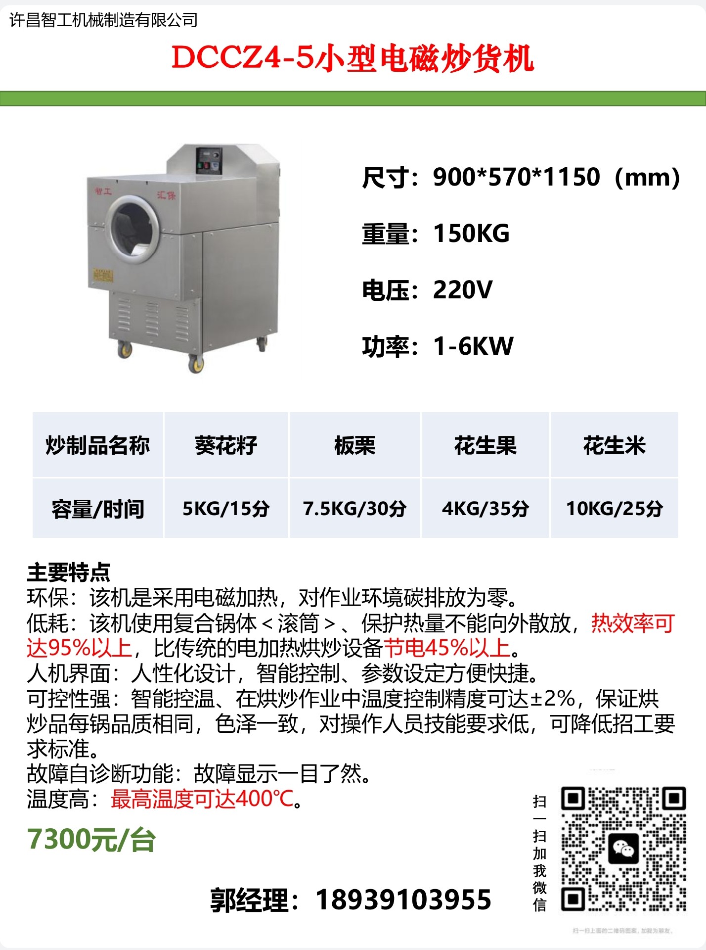 立式的滾筒的鍋究竟哪個(gè)好,這個(gè)也說(shuō)法不一,一般北方愛(ài)用立式鍋,優(yōu)點(diǎn)是直觀,簡(jiǎn)便,顧客能看到栗子在鍋里翻騰,能吸引顧客,南方用滾筒的也不少,優(yōu)點(diǎn)是出貨量大。說(shuō)道炒出栗子的效果,立式的,滾筒的,煤氣的或電的,效果都差不多,但我個(gè)人比較喜歡電磁滾筒炒鍋,我總覺(jué)得明火炒栗子沒(méi)有電炒鍋安全和環(huán)保,很容易發(fā)生事故,對(duì)環(huán)境危害也不小,而電炒鍋里最為省電的無(wú)疑是電磁炒鍋,說(shuō)到電磁炒鍋就不得不提一下許昌智工研發(fā)生產(chǎn)的多功能電磁炒貨機(jī),推薦的理由如下。