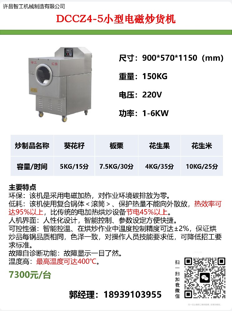 節(jié)能、省時(shí)、環(huán)保:采用電磁加熱,沒(méi)有碳排放,對(duì)作業(yè)環(huán)境碳排放為零。使用不銹鋼或碳鋼滾筒加熱,筒體外有保溫,保證熱量不能向外散放,熱能利用率高,比傳統(tǒng)的電加熱烘炒設(shè)備節(jié)能。